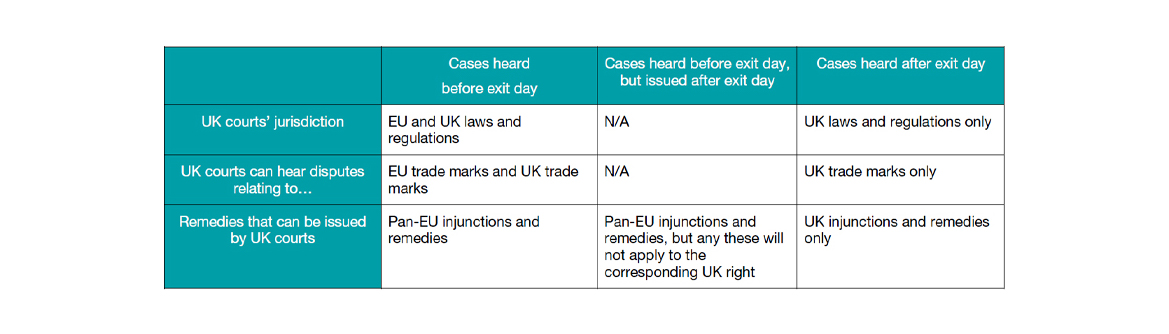 While the UK government anticipates that there are only a small number of ongoing cases that will be ‘stuck in the middle’, rights holders will need to bear in mind that if their case is heard before exit day, but issued after exit day, pan-EU injunctions and remedies may still be issued but will not be applicable to the corresponding UK right. A convenient summary is provided below: